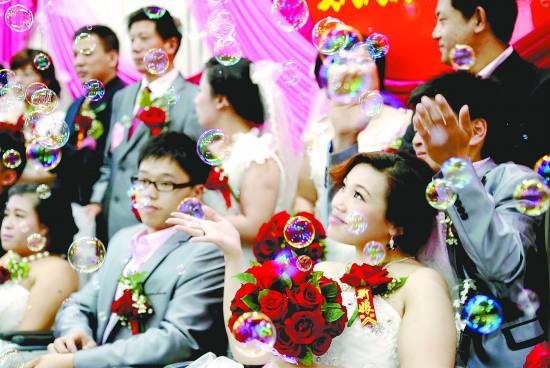5月11日,参加集体婚礼的新人们在婚礼现场接受亲友祝福。