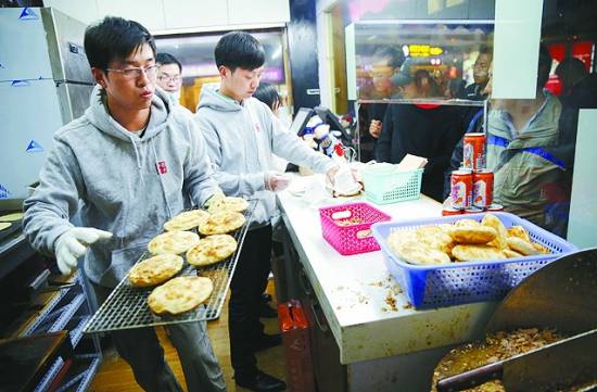 4月20日,北京五道口,宋鑫(前)在烤饼,孟兵在招呼顾客,并递送肉夹馍。这个大学生的创业店充分利用了微信,图文并茂地讲故事,还贴上描述具体位置的地图,给附近知名IT公司员工免费赠送,吸引了大量的顾客。
