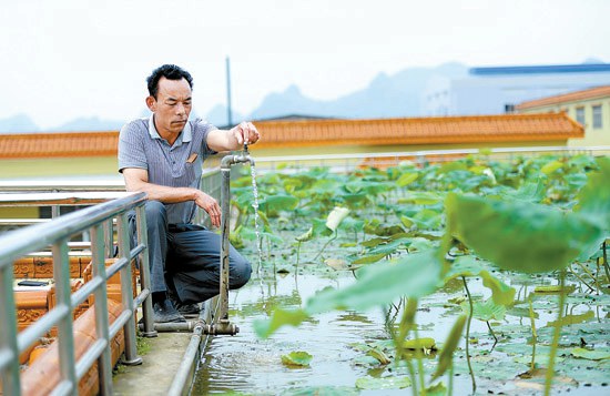 5月12日,在广西柳州市新兴工业园穿山园区的一家酒企楼顶上,工人谭兆喊打开水龙头为荷花塘补水。该企业“楼顶田园”面积约3亩,种着水稻、蔬菜、荷花,养着荷花鱼、田螺等。酒厂产出的酒糟可作为肥料,楼顶作物还调节了车间内的气温,利于该酒厂酒类的生产和储存。“楼顶田园”合理利用空间提升效益,展现着企业经营者对于绿色循环经济的思考与探索。