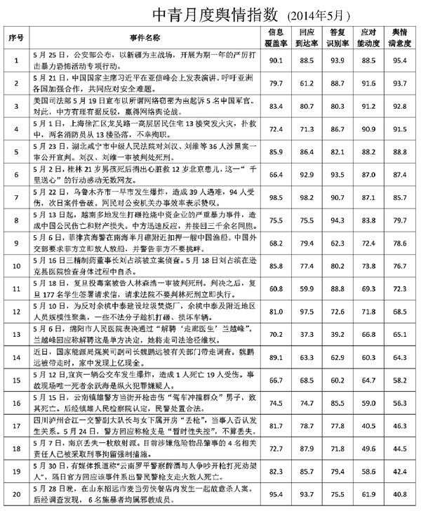 “中青月度舆情指数”是中国青年报社中青舆情监测室推出的一项舆情公共服务产品。旨在以问卷调研方式,针对月度发生的舆情热度排名前20位的事件,向专家学者、政府公务员、媒体人、意见领袖、普通网民5个群体收集民意。不同群体从中青舆情指数样本调研库中,随机抽取。5个群体样本选取量一致。指数以信息覆盖率、应对能动度、回应到达率、答复识别率、舆情满意度5项指标,根据5个群体的打分,加上中青舆情监测室对热点事件的监测数据,经加权计算,形成衡量各地、各级政府机关的舆情响应能力的指标,以期和读者一同推动社会进步。