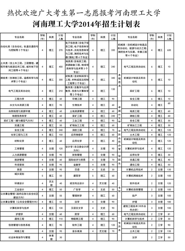 河南理工大学2014年面向30个省份计划招收8946人(其中部分专业在河南、安徽、河北、江西、海南等省列入本科一批招生),其中本科7730人,专升本386人,专科830人。河南理工大学万方科技学院(独立学院)2014年面向18个省份计划招收9353人,详见各省份招生部门公布的招生计划。