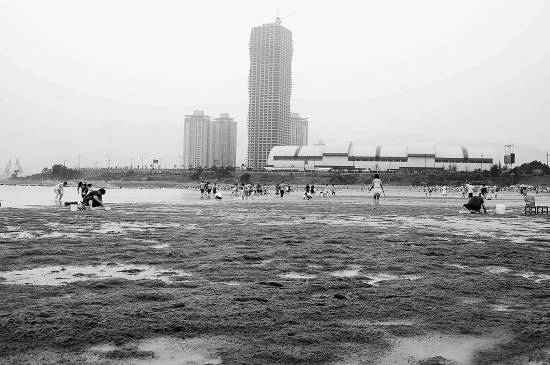 6月15日,游客在江苏连云港一海滨公园浒苔铺就的“绿毯”上玩耍。6月初以来,浒苔“前锋”抵达连云港多处海域,该海滨公园沙滩上的一些浒苔被海浪推到岸边堆积,相关部门已组织人员进行了集中打捞清理。CFP供图