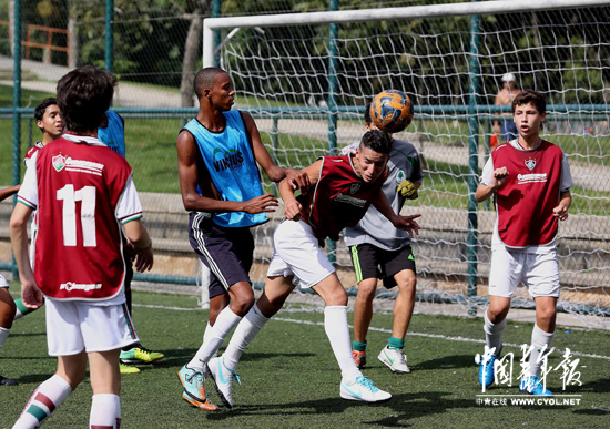 当地时间6月14日,巴西少年在里约热内卢街头球场踢球。本报记者 刘占坤摄
