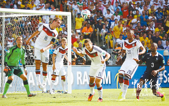 里约热内卢中午1点,天上明晃晃的太阳洒下酷热,温度计的读数停在30摄氏度不肯再往下走,这让马拉卡纳体育场内对战的德国球员和法国球员更加小心呵护自己的体能——本届世界杯德国队对法国队的1/4决赛,当地时间7月4日下午在马拉卡纳球场举行,淘汰赛的残酷让双方更加谨慎,但德国队后卫胡梅尔斯在第12分钟的头球得分,早早打破了场上的均衡态势。