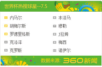 巴西队以2∶1战胜哥伦比亚队,与德国队会师半决赛。但可惜在比赛中,巴西头号球星内马尔被哥队后卫苏尼加从背后撞倒,被紧急送往医院。经院方检查,发现内马尔第3节椎骨破裂性损伤。随后巴西队医宣布,确定内马尔告别本届世界杯。内马尔的伤别和詹姆斯·罗德里格斯所在球队被淘汰使得这场星光对决黯淡收场,据360新闻世界杯热搜数据显示,胡梅尔斯、克洛泽、克罗斯、本泽马、穆勒、J拉姆、梅西和诺伊尔成为当日热搜球星。