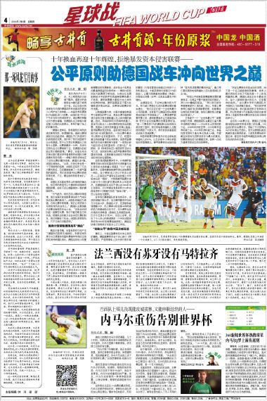 本报讯(记者梁璇)北京时间7月5日凌晨,随着法国队球星本泽马最后一脚射门被德国队门将诺伊尔用手臂挡出,高卢雄鸡被德国战车挡在了4强之外。德国队以1∶0取胜,连续第4届进入杯赛半决赛。