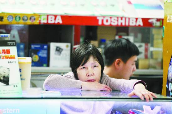 图为2015年1月22日,中关村e世界商城店铺工作人员黯然神伤。