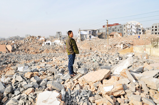 百炉屯小学副校长李末,站在废墟上凝望着学校,正是有了他们的坚守,学生才得以正常上课。CFP供图