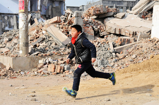 近日,郑州,百炉屯小学是一所挺立在废墟上的小学,学校700多名学生,70%为进城务工人员的子女。 与百炉屯小学紧紧相邻的一家幼儿园,也被废墟包围。CFP供图