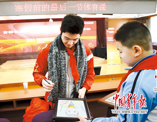 1月27日,北京史家小学分校,奥运冠军邢傲伟在该校学生为他所画的漫画像上签名。当日,在该校“寒假前的最后一节体育课”上,邢傲伟受邀和部分学生及家长分享自己的运动故事,他建议家长在寒假期间多利用社区及公园里的体育设施,和孩子一起锻炼。