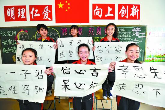 1月28日,海口市坡博实验学校的学生在展示自己的“家训”。近日,海南省海口市坡博实验学校为全校1200多名学生布置了一道特殊的家庭作业——与父母一同寻找自家的“家训”,将社会主义核心价值观融入家庭教育,营造学生积极向上的成长环境。