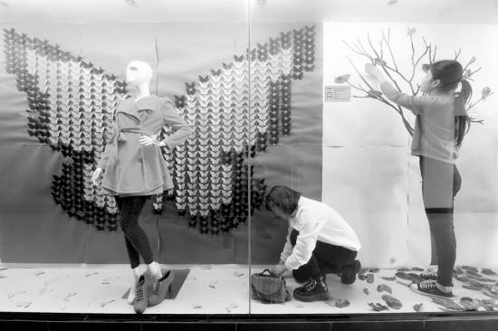 3月19日,浙江纺织服装职业技术学院时装学院服装陈列与展示设计专业的学生正在布置橱窗设计作品《蝶飞恋舞》,而这样的立体展示布满了学校的整条百米廊道。