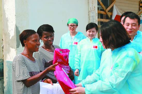 4月4日,医疗队副队长邵蔚(右前)向被治愈的埃博拉出血热患者赠送礼物。当地时间4日上午,两名重症埃博拉出血热患者走出塞拉利昂中塞友好医院埃博拉诊疗中心的大门,这是中国第四批援塞医疗队首批治愈出院的患者。