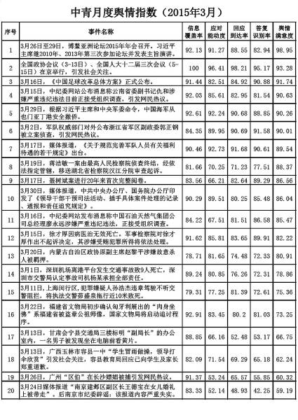 今天,中国青年报社中青舆情监测室发布2015年3月“中青月度舆情指数”(总第20期)。