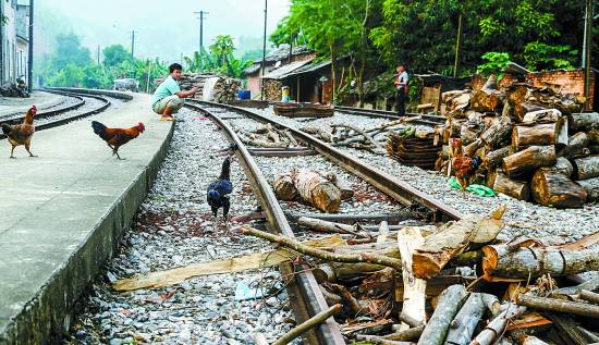4月1日晚,滇越铁路老范寨站附近,鸡在铁路和村民的木材里穿梭。这个站点已经取消,站牌都已被涂成了白色,沿途居民为了出行一度靠滑索到南溪河对岸去坐车。