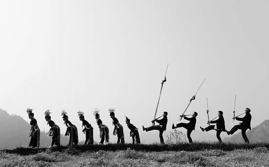 4月5日,贵州省黔东南苗族侗族自治州丹寨县排调镇麻鸟村的十多名苗族村民,应邀为慕名而来的中外游客在田间表演国家级非物质文化遗产锦鸡舞。其绚丽的服饰、独特的舞姿令游客赞叹不己。