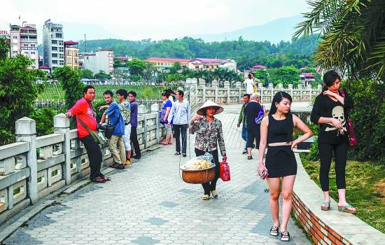 4月3日,河口中越边境附近,一个越南小贩和中国游客相遇。