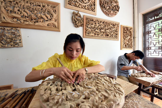 4月2日,雕刻技工在精雕作品。江西余江县雕刻经过40多年的发展,已形成一定的产业基础和技术、人才、资源和品牌优势,并将独具特色的雕刻文化资源优势逐步转变为经济发展优势。目前,全县共有雕刻企业及加工点、家庭作坊上千家,从业人员达3万人,产品涵盖木雕、根雕、铜雕、玉石雕4大类,共2000多个品种。产品远销多个国家和地区。