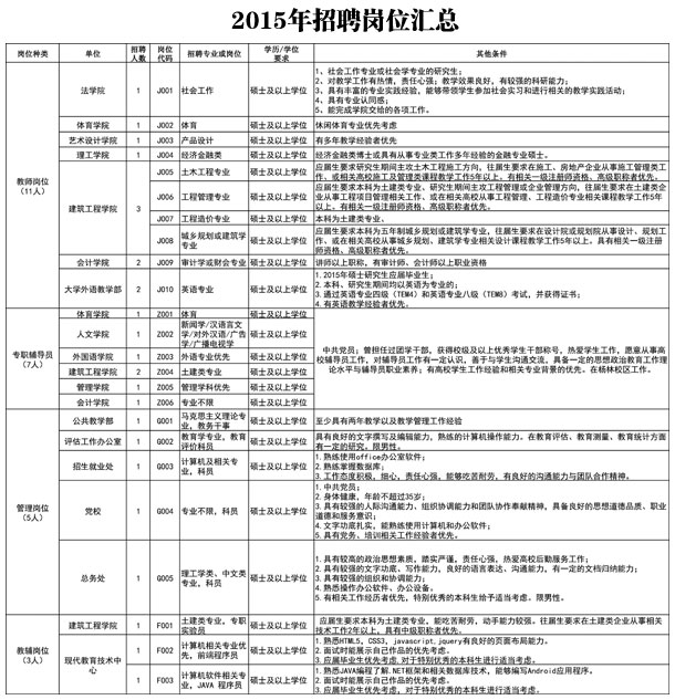 为适应学院发展的需要,2015年我院继续面向社会公开招聘专职教师、专职辅导员、管理人员、教辅人员,特别是引进具有高校教学经验的高职称、高学历优秀教师和 “双师型”教师。现将有关事项公告如下: