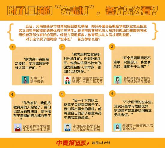 记者致电郑州外国语学校教务处,一位工作人员称:“咱们学校没有专门的考试,就是统一的中考考试。宏志班主要是面向家庭贫困的学生,需要有乡级以上政府开的贫困证明。不需要提前报名,5月,中招填报志愿的时候,你注意看有没有提前批次,上面填报理科实验班或者宏志班都行。”