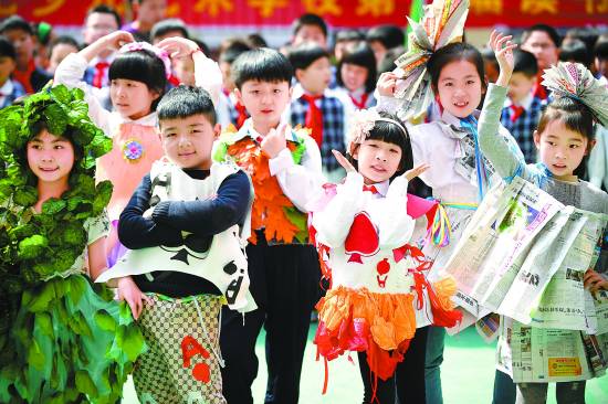 4月21日,小学生们在展示“环保时装”。当日,安徽省合肥市少儿艺术学校开展“地球日童心飞扬环保时装秀”主题活动。孩子们身着由废报纸、布头、塑料瓶、绿植等材料制成的“环保”主题时装,倡导低碳生活、节约资源,以自身行动关爱地球,迎接世界地球日。