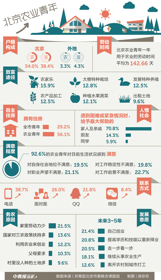 河北保定姑娘赵红敏是北京农业青年中少见的外地农业户籍。因为“到北上广的年轻人都在城市里,没有人来农村”。在北京市农业青年中,北京农村户籍占54.0%,北京非农户籍占38.4%,外地农业户籍占3.3%,外地非农户籍占4.3%。