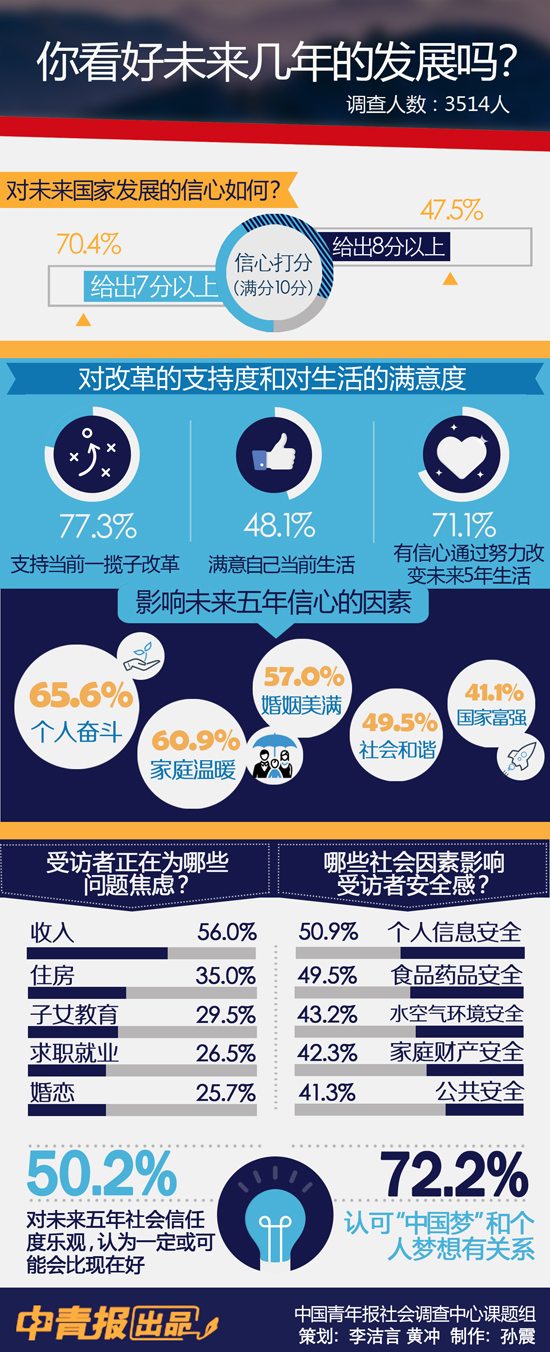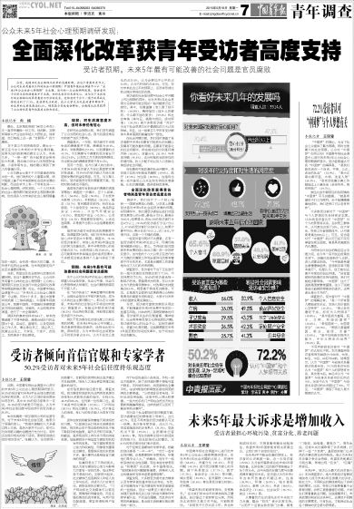 当前,我国正处在全面深化改革的关键时期。在这个重要历史节点,公众对未来有着什么样的社会心理预期?公众的心理预期又会给正在进行中的全面深化改革带来哪些积极反馈?对此,中国青年报社会调查中心以“未来5年公众社会心理预期”为主题,历时1个多月,通过中国青年报纸媒(二维码调查)、中国青年报微信公号、民意中国网、中国高校传媒联盟官方网站校媒网、问卷网、大谷网等多种渠道,进行了一次全面调研。