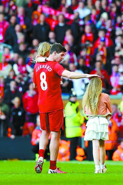 5月17日,在利物浦与水晶宫的赛后,利物浦在安菲尔德主场为杰拉德举行告别仪式。图为杰拉德带着女儿出现在仪式上。
