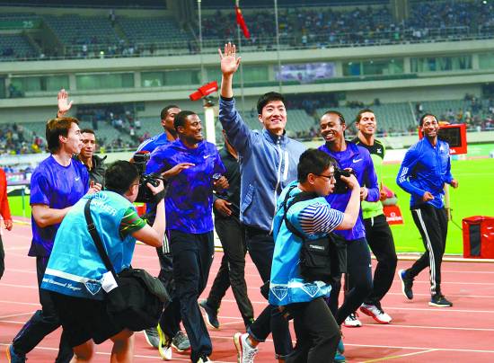 5月17日的上海体育场内,刘翔在9位男子110米栏选手的簇拥之下绕场一周,向看台上的观众挥手告别。简短的退役仪式上,身着灰色运动外套和蓝色牛仔裤的刘翔深吸一口气,转过身去,极力控制着自己的情绪。不到5分钟的发言过程中,刘翔数度哽咽。当他说到“我想说在我生涯中碰到过很多困难和挫折,但我从未退缩、逃避、害怕过”时,看台上再次响起热烈的掌声。CFP供图