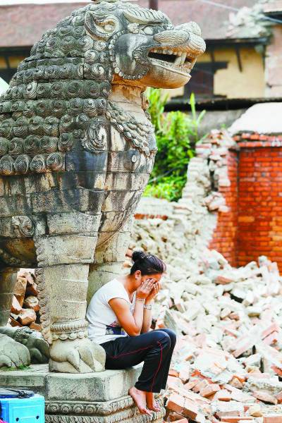 巴德岗灾民安置点,一位失去家园的女孩坐在石狮下休息,巴德岗是这次尼泊尔地震受灾严重的地区。