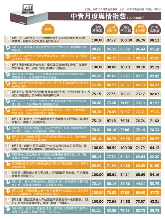 今天,中国青年报社中青舆情监测室发布2015年5月中青月度舆情指数(总第22期)。