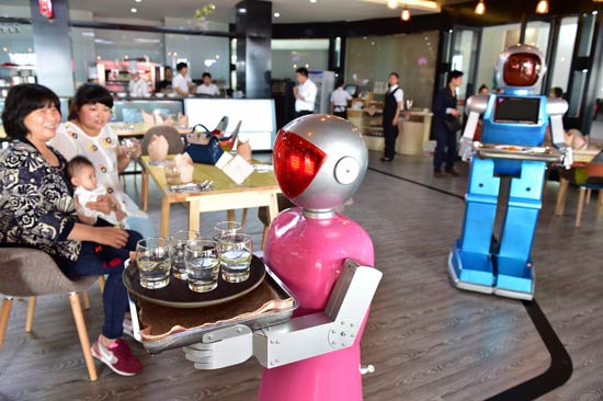 5月18日,浙江金华90后大学生创客制作的送餐“情侣机器人”吸引市民前来就餐。