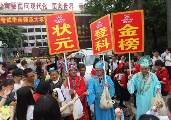 6月7日,广东广州,2015年高考首日,考场外成为商家竞相展露风采的舞台。华师附中考点外,某百货员工身着戏服,手举“状元”、“登科”、“金榜”字样的牌匾在现场派发扇子。众多商家比考生来得早,比家长更卖力,上演一场你争我夺的“卖家秀”。CFP供图