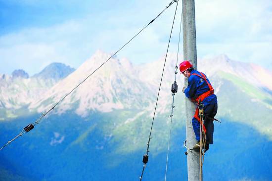 在海拔约3500米的四川甘孜藏族自治州白玉县建设镇日西村项目点,电力工作人员进行登杆作业(6月26日摄)。该县河坡乡生戈村是国家电网无电地区电力建设最后一批通电的村庄。