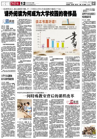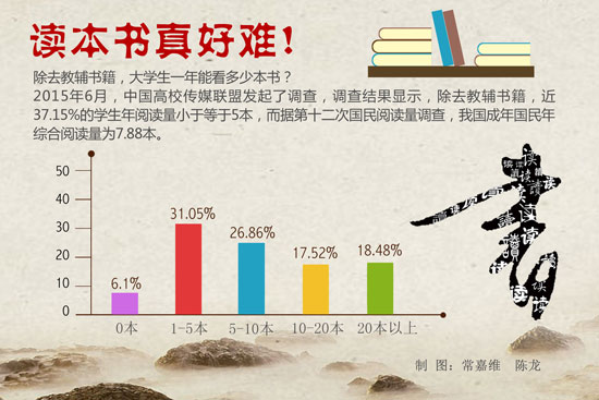 2015年6月30日,中国高校传媒联盟面向525名在校大学生开展了一项调查,覆盖了27个省(区、市)。调查结果显示,从去年6月至今年6月,除去教辅书籍,37.15%的大学生阅读图书量低于5本,其中6.13%的人课外阅读量为0。