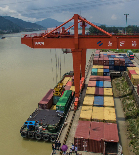 7月22日,首批跨境电商B2B出口货物在浙江富阳东洲码头跨境电子商务综合实验区物流港装货上船。