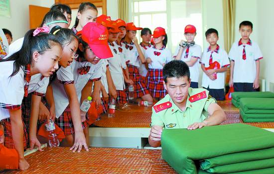 参加“体验消防 快乐暑期”主题消防夏令营活动的小学生学习如何把被子叠成“豆腐块”。暑期来临,广西钦州市子材小学180名学生走进钦州市消防支队钦北大队钦南中队营区,在轻松的氛围中学习消防知识,掌握火场自救逃生技能,提高消防安全意识。