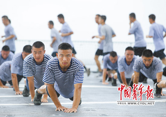 7月19日,海军综合补给舰微山湖舰上,兰正武带着特战队员在后甲板冒雨训练。“嗨—嗨—嗨—”队员们一边打着军体拳,一边有节奏地喝道。