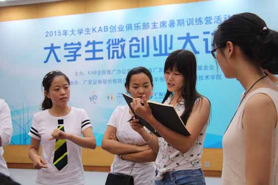 这是“大学生微创业行动大讲堂”的上海现场,台下凝神静听的是来自各地高校的创业社团主席,这次大讲堂是2015年大学生KAB创业俱乐部主席暑期训练营5天活动的一部分。广发证券股份有限公司监事长吴钊明介绍,大学生微创业行动由KAB全国推广办公室与广东省广发证券社会公益基金会联合发起,已经在清华大学等各地高校举办了7次大讲堂活动,目前微创业项目正在火热征集中,欢迎大学生投身创业行动。
