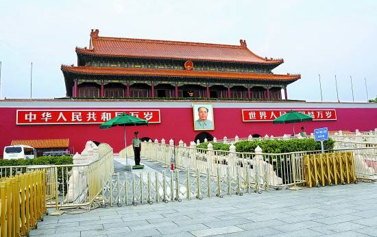 7月26日,北京,经过半个月的维护粉刷,天安门城楼焕然一新。为迎接9月3日纪念抗日战争胜利70周年阅兵式,天安门城楼的粉刷工作于今年7月11日启动。