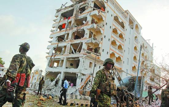 7月26日,在索马里首都摩加迪沙,士兵经过汽车炸弹袭击现场。