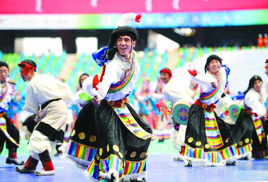 8月9日,西藏自治区代表团在入场仪式上表演《鼓舞欢歌》。