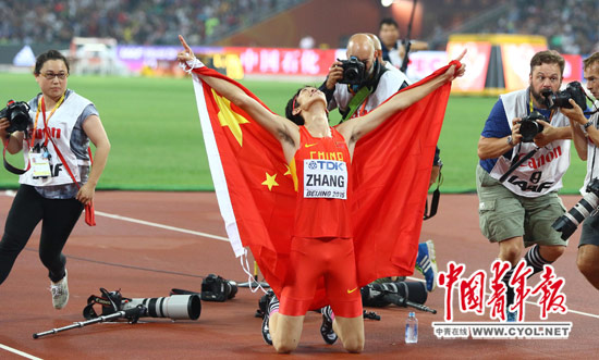 张国伟身披五星红旗庆祝。8月30日,在北京田径世锦赛男子跳高决赛中,中国选手张国伟以2米33的成绩与乌克兰选手邦达连科并列获得银牌。