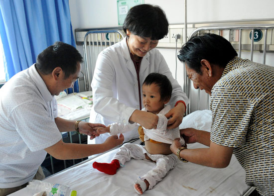 顾虹(中)在北京安贞医院小儿病房帮助由她主要筹款捐助手术治疗的其美拉姆穿衣服(2014年9月9日摄)。