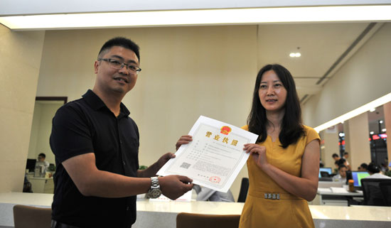 9月1日,成都天府新区政务中心工商窗口向成都某公司颁发了统一社会信用代码的工商营业执照,这是四川以及中国西部地区启动“三证合一”登记制度改革后颁发的首张工商营业执照。据悉,推行“三证合一、一照一码”,进一步便利了企业注册。刘忠俊/CFP