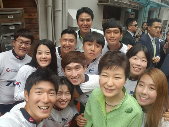 9月4日,骑行队队员与韩国总统朴槿惠共同见证了上海“大韩民国临时政府旧址”展馆更新启用的剪彩仪式,并与朴槿惠总统“自拍”留念。