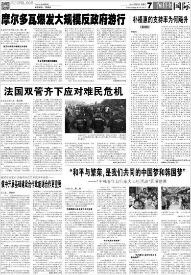 这种时代变化,在韩国队员全汉滨眼中也有着特别的意义。24岁的全汉滨,是曾参与重庆临时政府活动的独立活动家李奉真(音)先生的外孙。全汉滨说:“当我们从报纸上看到‘中韩青年自行车大长征活动’的招募启事时,我父亲就让我一定要争取去参加这个活动。我的外公虽然已经去世了,但我可以通过这种方式去纪念外公、纪念先辈们经历过的那段历史。这是尽了最大的孝道,我为此感到自豪。”