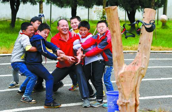 9月8日,毕首金老师(中)带着几名学生在玩用木头自制的“大弹弓”,弹出的球也是他用破布做成的。今年51岁的毕首金是云南省昆明市大板桥街道白汉场中心小学的体育教师,1984年初到这里时,他发现学校的体育场地和学生的体育器材极度匮乏。31年来他利用木条、旧轮胎、塑料瓶等废旧材料制作体育教具。如今他自制的体育器械多达106种、8900多件,其中包括36个发明专利品。