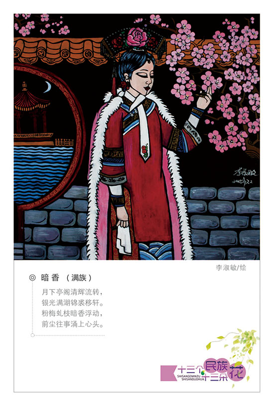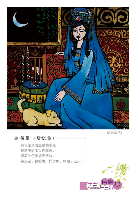 《十三个民族十三朵花》系列装饰画在印制成明信片时配了短诗,诗文的作者是李淑敏43岁的母亲刘玉萍。她在《塔吉克族》这幅画的配诗《憧憬》中写道:“在离太阳最近的冰山下,跳动着一颗拥抱太阳的虔诚之心。高原上奶茶飘香,滋养着少女对美好未来的无限憧憬。”