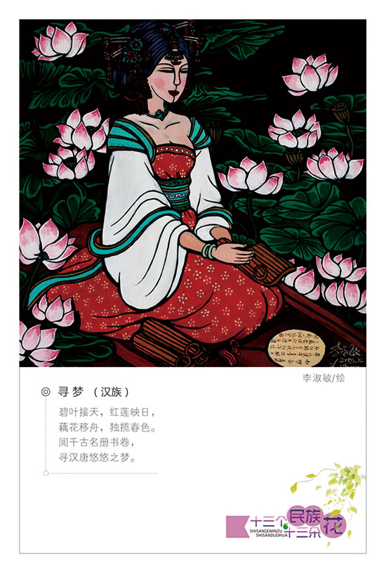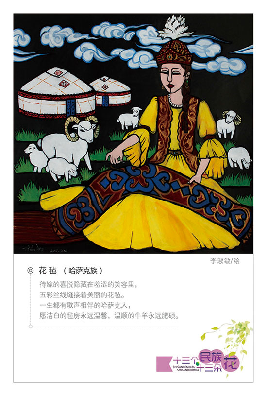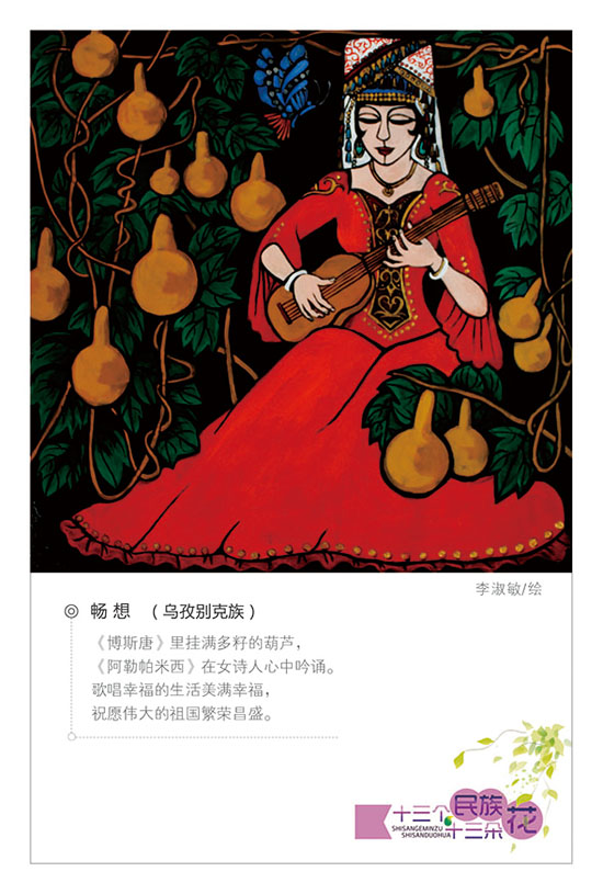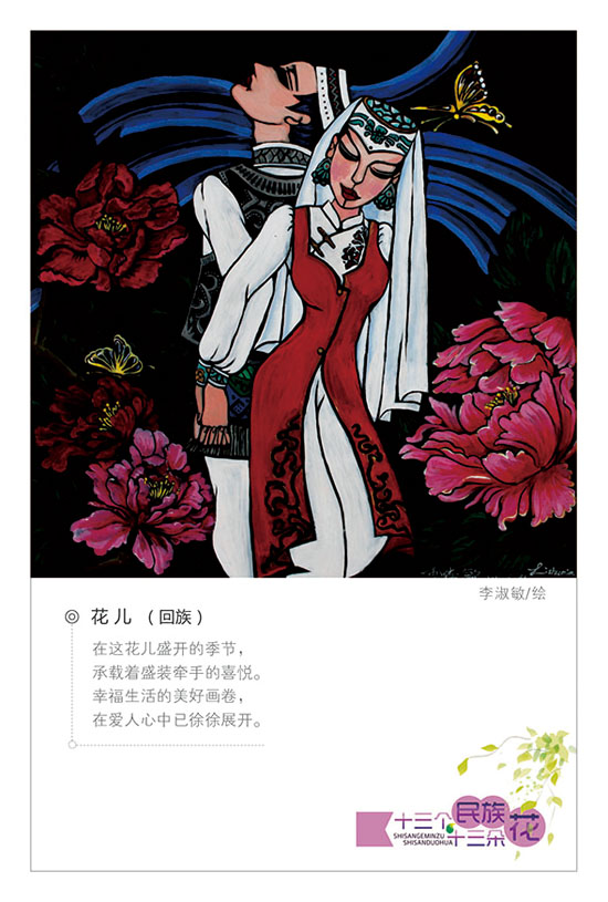 “在历史的沉淀、文化的传承中,新疆逐渐形成了13个世居的民族。勤劳、善良的各族人民在生活上相互帮助、理解,在文化上相互影响、交融。在保留各民族鲜明特色的基础上,兼容并蓄、博采众长、推陈出新。各族人民在新疆这160万平方公里的大地上,书写着传奇,竞相绽放出美丽神奇的风采!”这是新疆维吾尔自治区乌鲁木齐市高级中学美术教师谢鸿为她的学生李淑敏《十三个民族十三朵花》系列装饰画写下的前言。